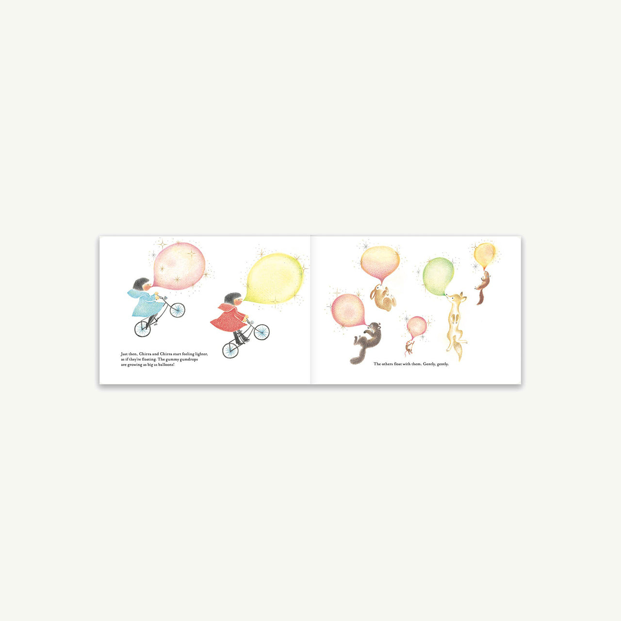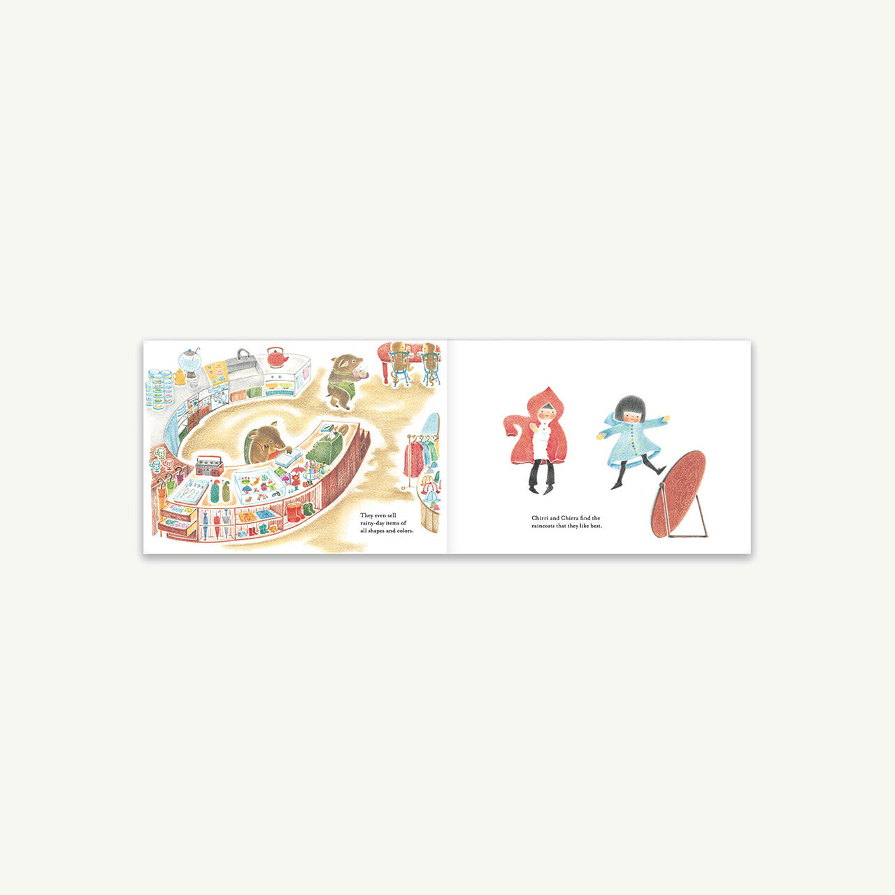 Dring-dring, dring-dring! The rain is falling, the bicycle bells are ringing, and Chirri and Chirra are off once more on a most enchanting adventure. In their matching raincoats, they pedal through puddles and soft gray light until they discover a tiny café open only on rainy days a place where tea is served with sweet rock candy and the air hums with quiet delight.