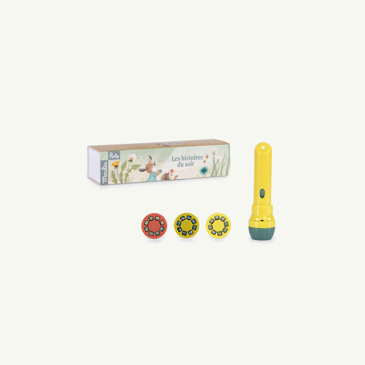 This enchanting set includes a storytime torch and three illustrated disks that project sweet bedtime adventures onto the walls or ceiling. Simply turn off the light, switch on the torch, and let the tiny rabbits lead you through their moonlit world.