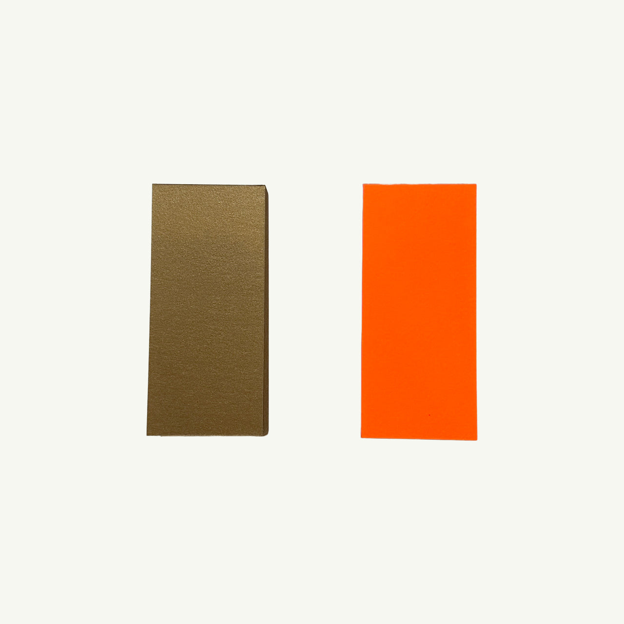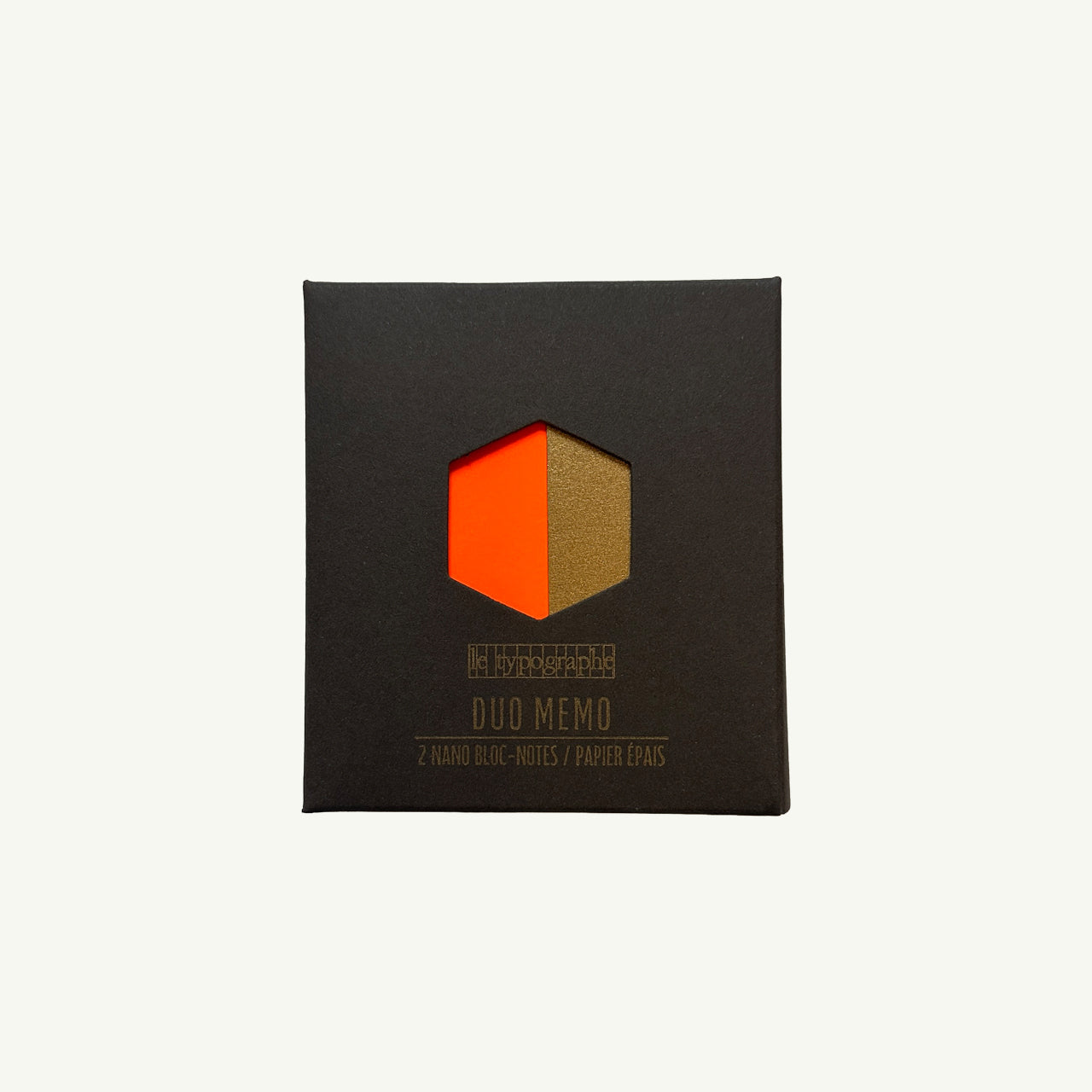 A delightful Duo Memo set: two tiny Nano notepads, each measuring 1.4 × 3.3 inches. One features a vivid 260g fluorescent paper, the other a handsome 300g shade, both bound with gleaming gold-colored glue.