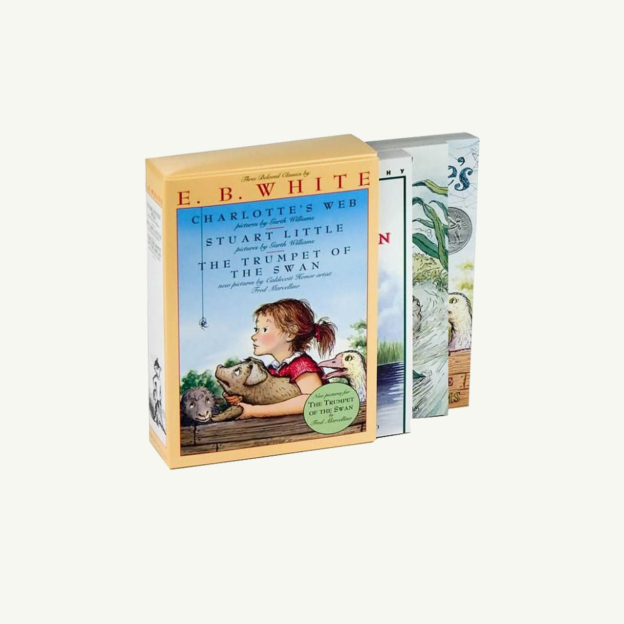 Three timeless tales from E. B. White gathered together like old friends at the same storybook table. Inside this handsome box are Charlotte’s Web, Stuart Little, and The Trumpet of the Swan — each a masterpiece of courage, friendship, and wonder, brought to life with black and white illustrations by Garth Williams and Fred Marcellino.