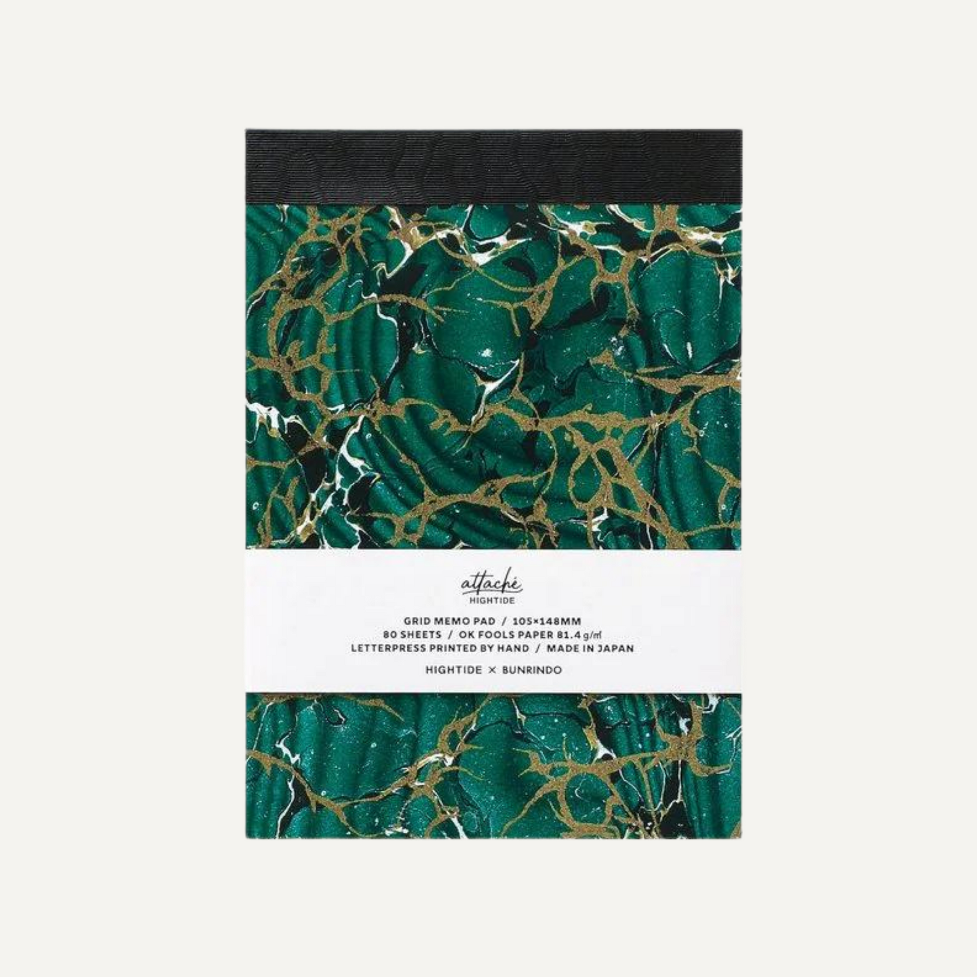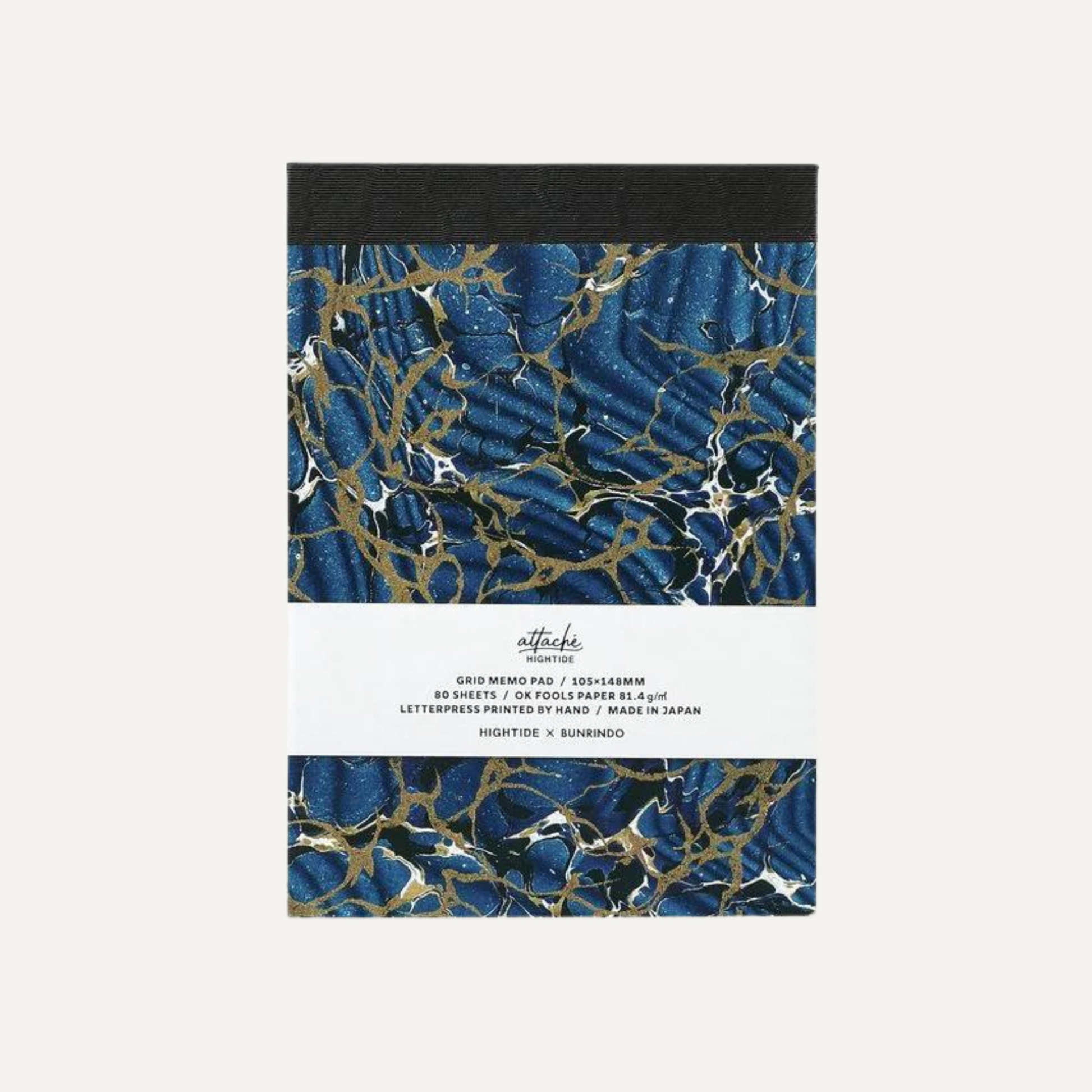 A luxurious memo pad with letterpressed grid pages encased in a marbled cover. Part of Attaché, a Hightide collection featuring marbled pattern with sophisticated gold accents.