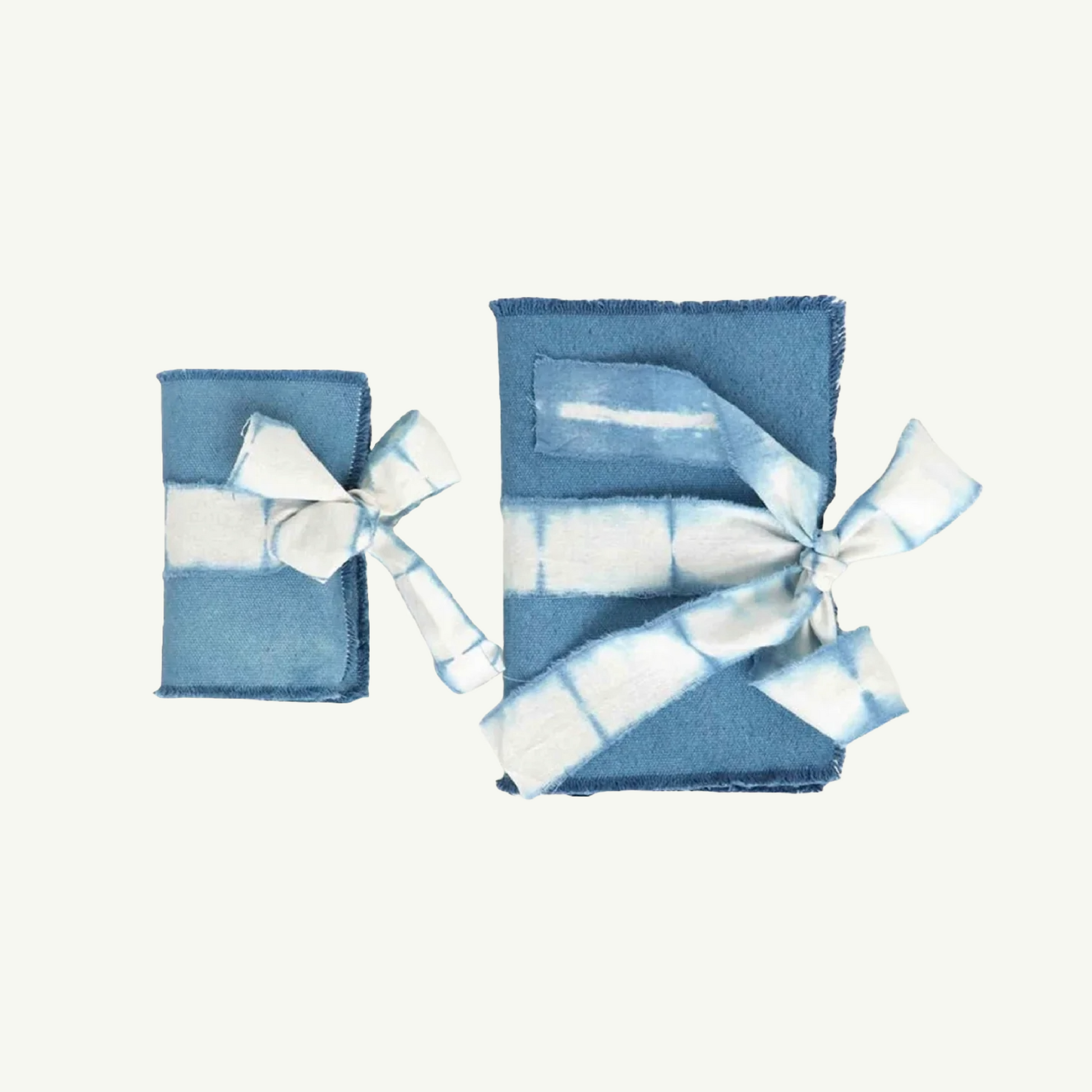 "This product is made with 100% recycled cotton handmade paper with deckle edge. Hand dyed with natural colors by the artisans of Craft Boat; complete with a natural dyed canvas wrap and cotton ribbon. A design that sparks ingenuity, our paper notebook is the space to think creatively. Time for a change in how you imagine the perfect notebook. Suitable for: The adults who like to stay out of the box Our recommendation: great for wet and dry artist media, including watercolor, gouache, and ink. Set of 30 sheets Large - 6"x4" Small - 3.5" x 2"