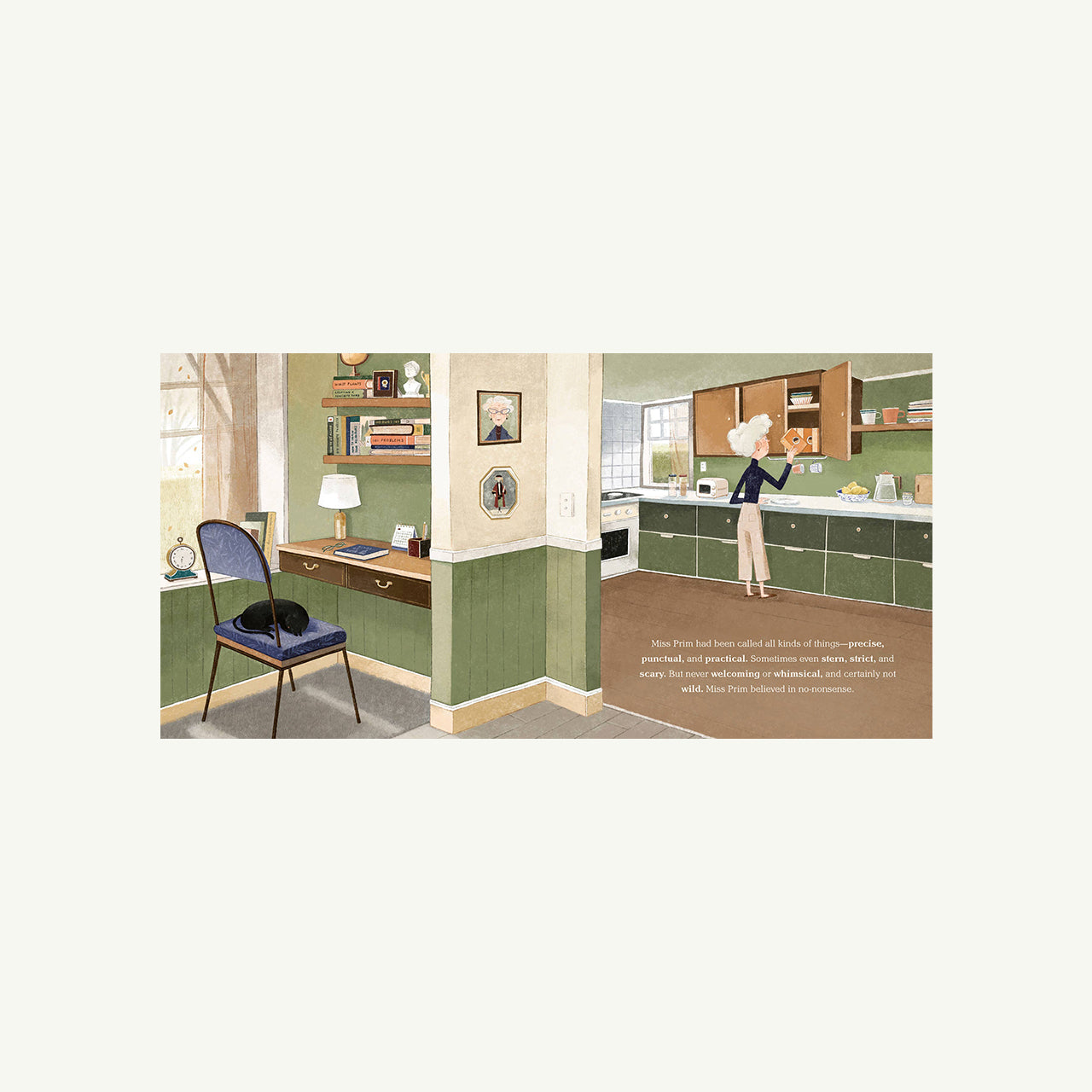 Miss Prim had been called all kinds of things—precise, punctual, and practical. Sometimes even stern, strict, and scary. But never welcoming or whimsical, and certainly not wild. Miss Prim believed in no-nonsense.