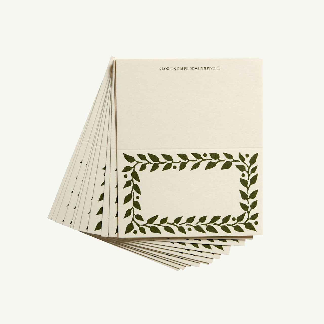 A smart pack of twelve Cambridge Imprint place cards, each bordered with a refined patterned frame in dark olive. Printed in England on sturdy 300gsm cream stock, responsibly sourced from well managed forests and produced with hand mixed inks of the most handsome shade.