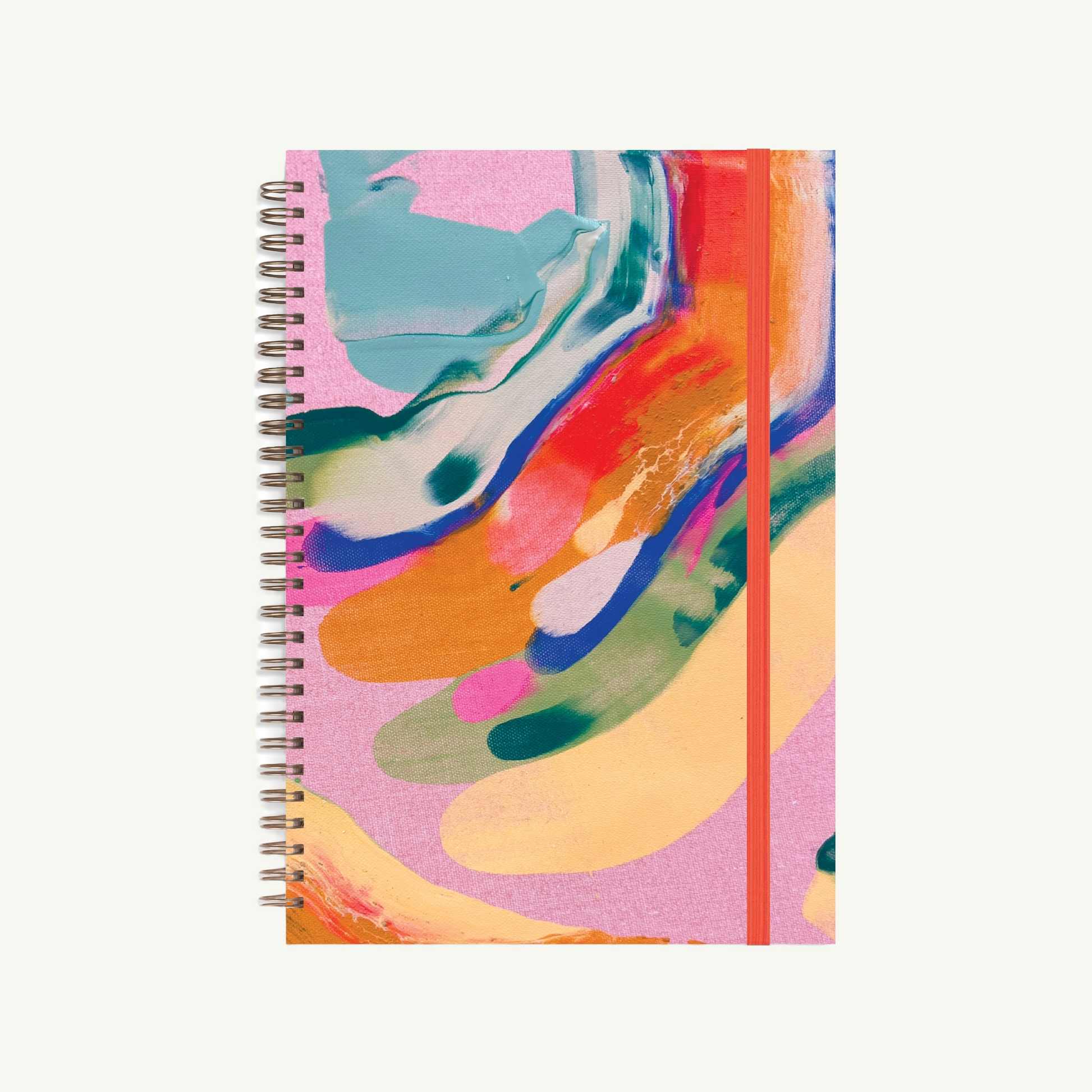 This Moglea notebook is a one-of-a-kind treasure, with a hand-painted cloth cover and matching back that make every piece unique. Bound with high quality wire and filled with 120 pages of FSC certified 103 gsm paper, it is as durable as it is beautiful. An elastic closure keeps your notes secure, while clear pockets provide a place for keepsakes and scraps. Handmade in the Moglea studio in Iowa, it’s a notebook designed to be both practical and artful.