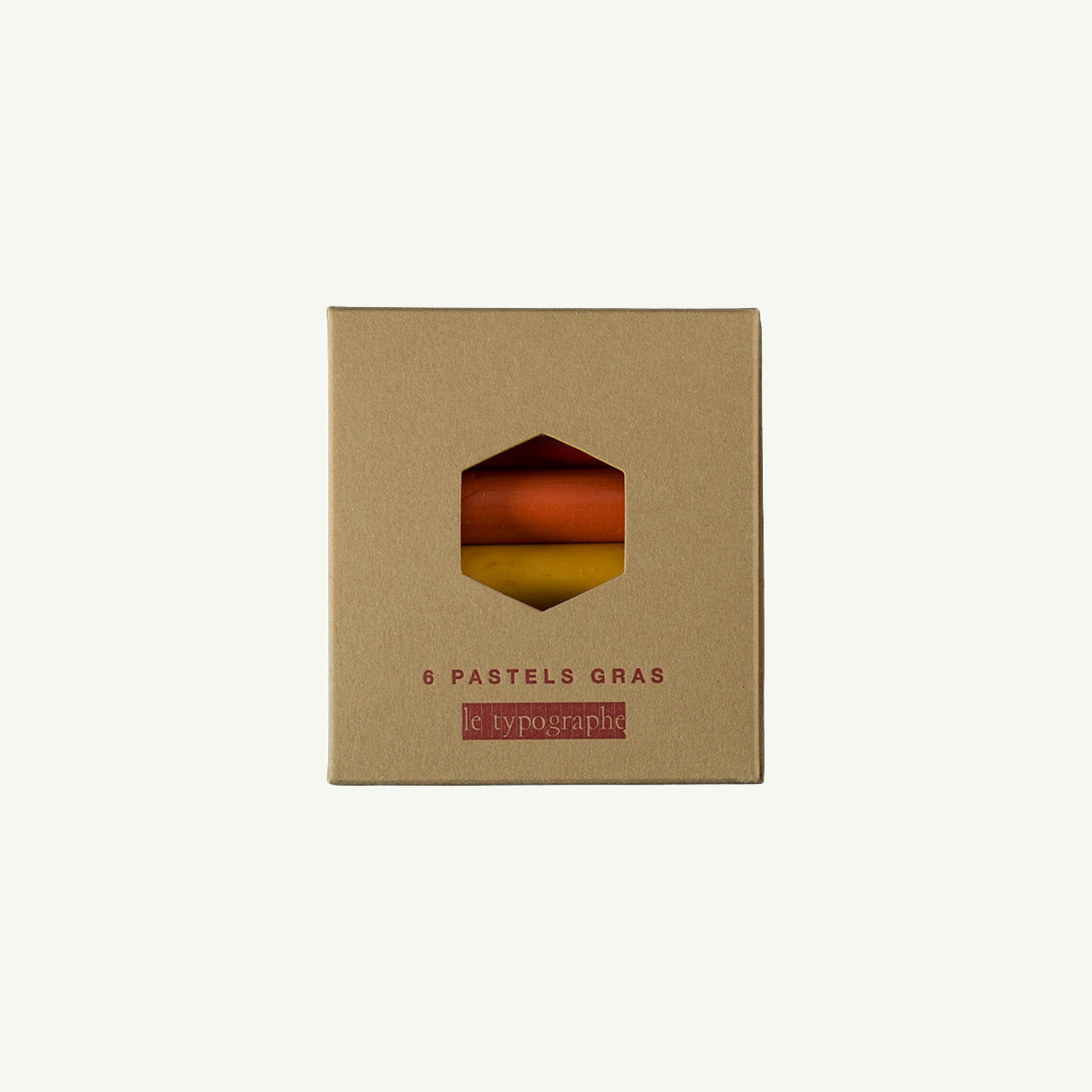 A handsome little box containing six oil pastels. Each pastel measures roughly 2.6 × 0.4 inches, perfectly sized for pockets, pencil cups, or moments of sudden inspiration.