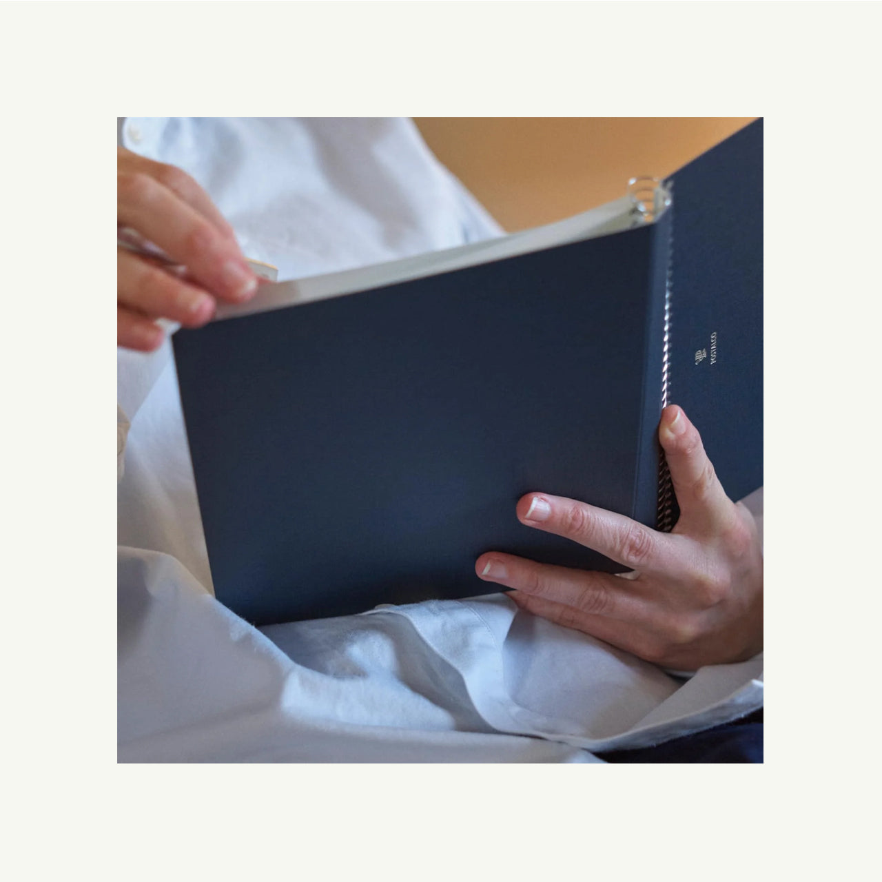 The craft of the Japanese paper maker is evident inside with pages lightly-textured to maximize each stroke of pen or pencil and printed with Postalco's calm-blue 1mm Pin-graph that guides linear writing yet is too fine to be obtrusive. Paper is ecologically made and chlorine free.