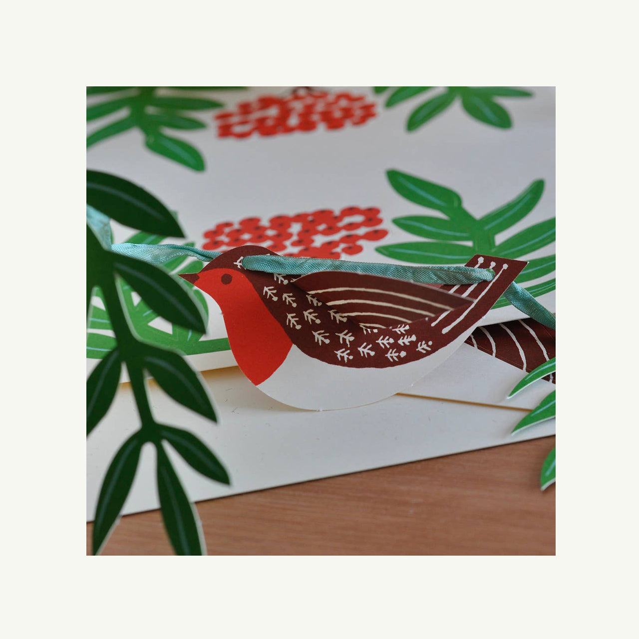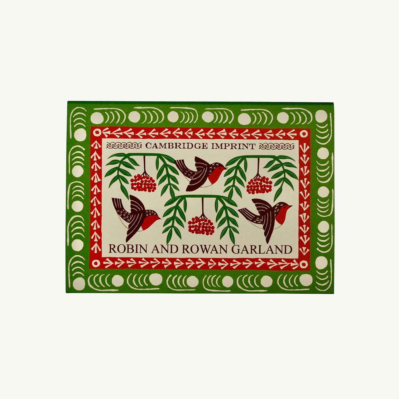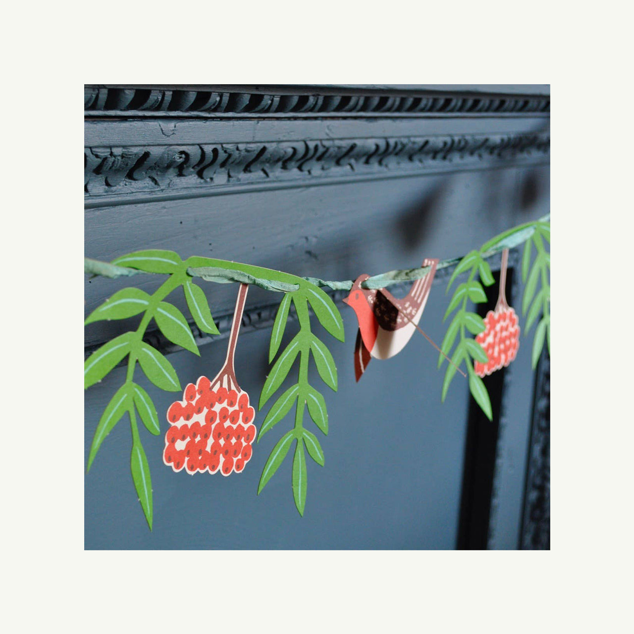 A flutter of robins and a whisper of rowan leaves, six sprigs and eight cheerful birds, all tucked neatly into a clever self-closing card wallet for safekeeping. Pop them out, string them together with yarn or ribbon of your choosing, and—presto!—you’ve a garland stretching two to three meters pure woodland cheer.