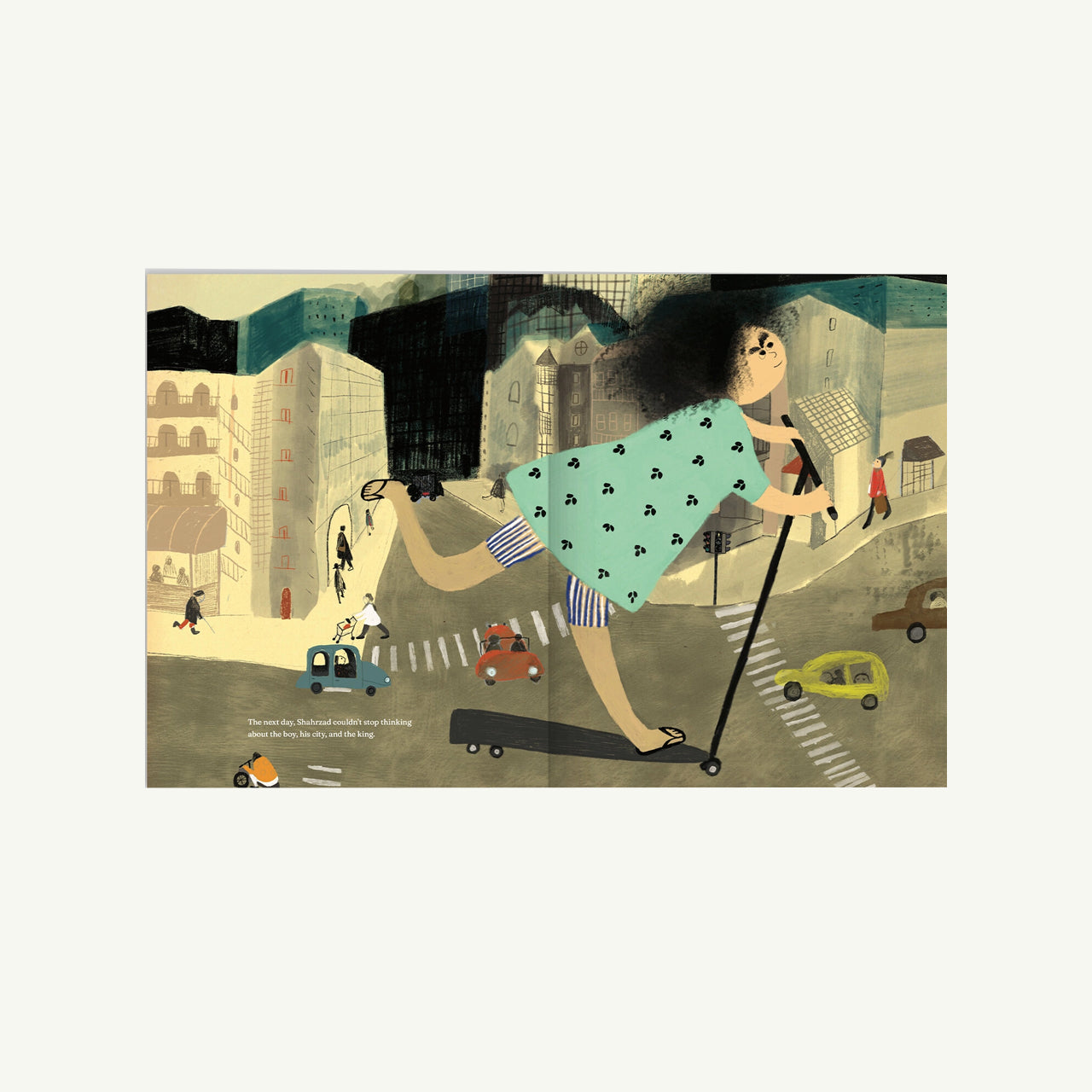 Meet scooter-riding, story-loving Shahrzad, a modern Scheherazade with a flair for imagination. When she hears a boy’s tale of a once-peaceful country ruled by an angry king, she cannot forget it. In her mind, she zooms off on a toy airplane to confront the king—armed not with swords, but with stories.