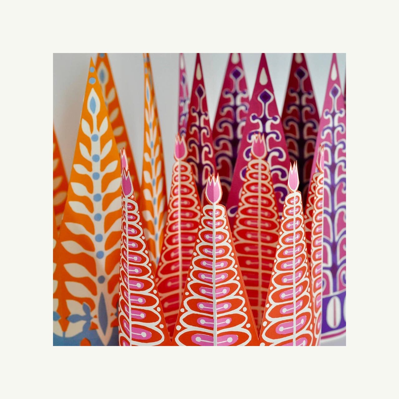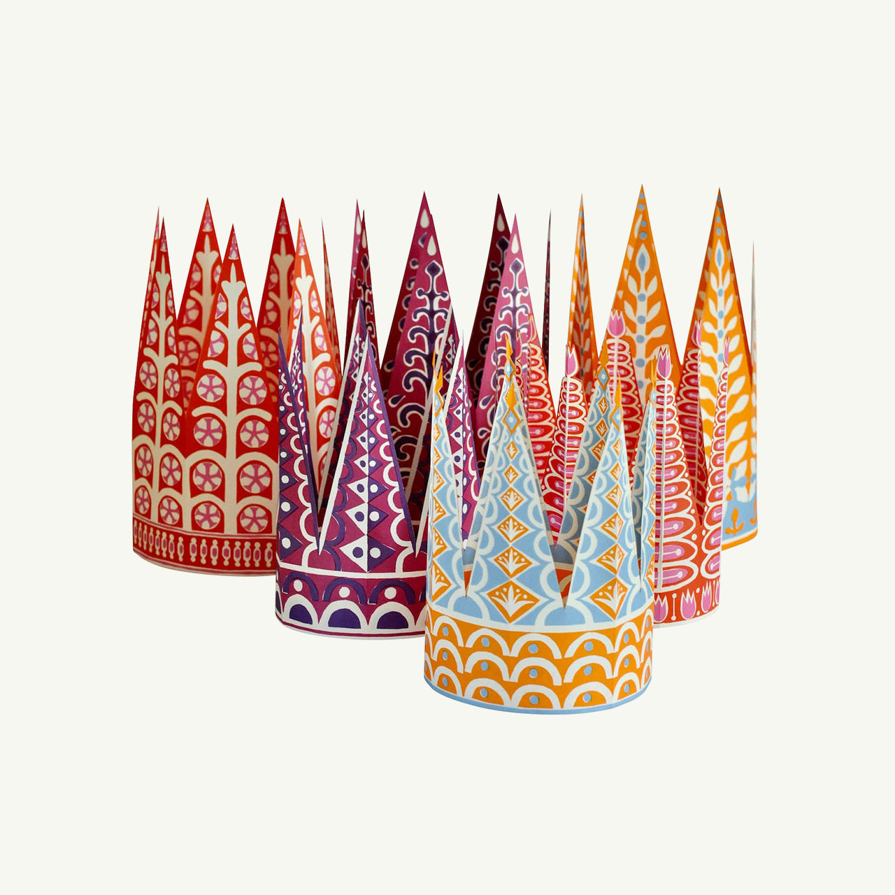 Let there be no more wilting tissue paper headgear at your holiday feast! These six tall, patterned crowns are fit for kings, queens, emperors, and eccentric uncles alike. Perfect for feasts, fêtes, high days, and holidays — anywhere one might raise a glass and demand a little pageantry.