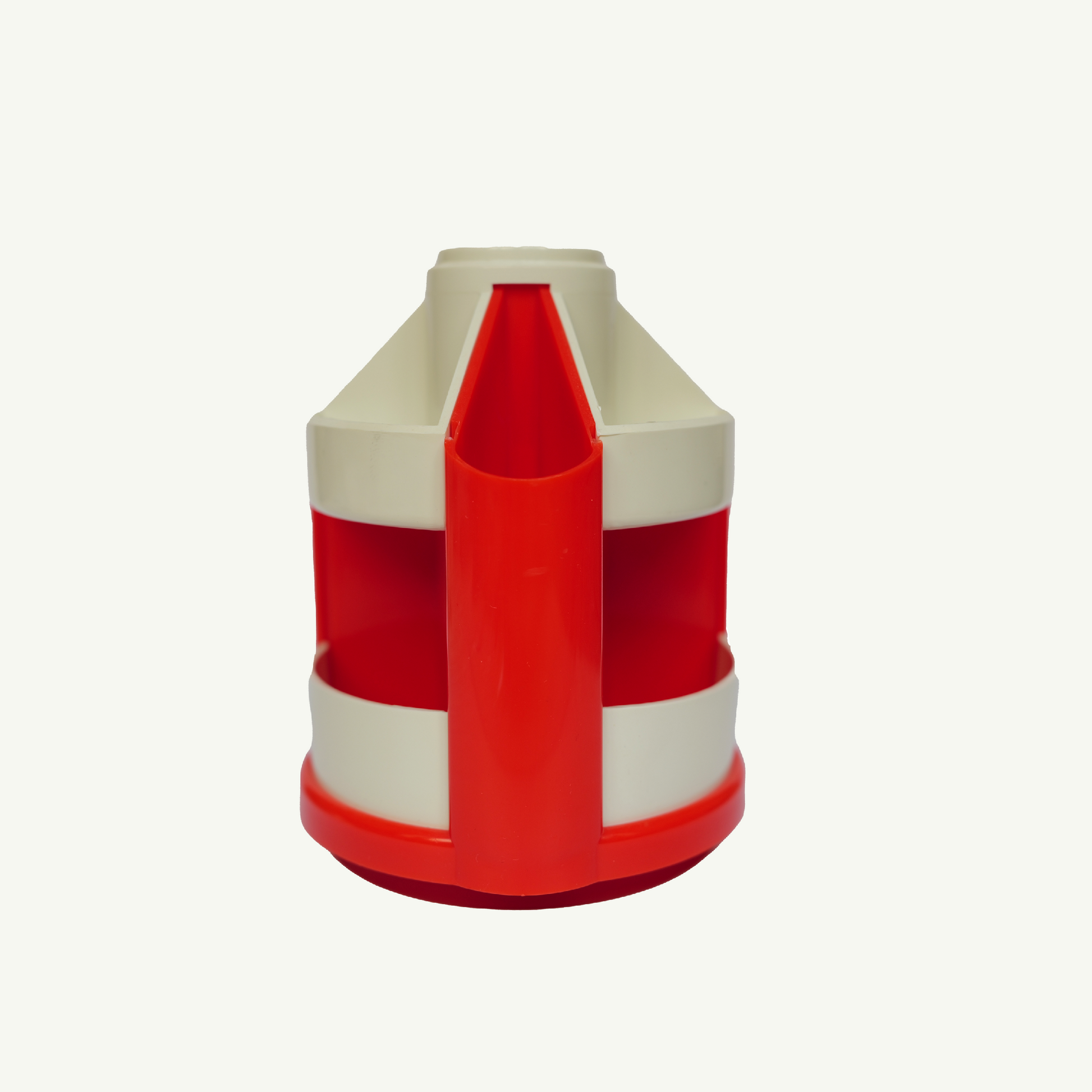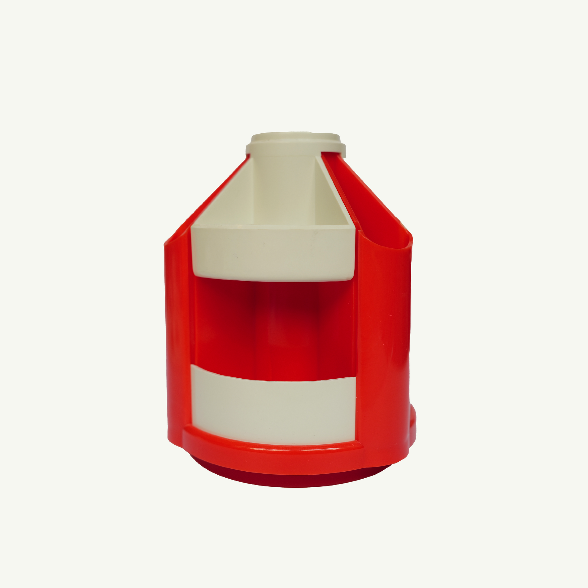 Behold, a rather splendid rotating desk companion from the glorious 1990s! This cheeky red and white organizer keeps your paper clips and writing implements in perfect order while spinning about like a proper London Eye for your stationery. Quite the vintage treasure for your workspace.